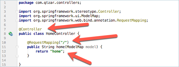 I’ve created a new package in my source to hold all my controllers called, you guessed it, controllers. In here I have created a new java class called HomeController and I have annotated it the @Controller annotation above the class name. I then added a single method to the class and I have annotated that with @RequestMapping(“/”) which means whenever a request comes in that matches the root of the site you should return the string ‘home’.