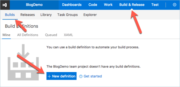 The build definition in VSTS is designed to build and compile your code and then take the resulting build and save them to an artifact store. You can create build definitions for Visual Studio applications, XCode applications, Android applications and, of course, Java applications. In VSTS go to the Build & Release section of your project and then make sure you are on the Builds tab. Click on the New Definition button to get started.
