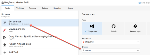 First lets make sure that we are building the right thing. On the Tasks tab you should see what sources it is building. It should say the name of your repository and the master branch. If not then select the correct branch.