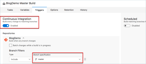 Over on the Triggers tab you should enable the Continuous Integration section. This will make sure that a build is triggered every time new code is pushed to the master branch. You can also setup scheduled builds so if you have some sort of nightly build process you can automate that here.