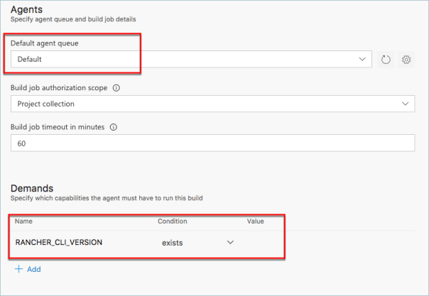 If you have multiple private build agents and not all of them are based on the Rancher VSTS Build Agent then you will need to add a ‘Demand’. When the build is queued it will look for a build agent that meets all the required demands, this is how you can make sure that Visual Studio builds run on windows boxes and XCode builds run on OS X boxes.